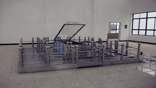 優(yōu)質(zhì)不銹鋼雙層圍欄,內(nèi)設(shè)不銹鋼平臺(tái),綠色草坪,特制液壓升降式透明高罩